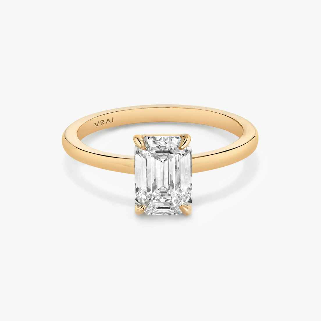 This solitaire ring is designed to sit low on the finger and flush with the wedding band. The emerald cut diamond can be placed horizontal or vertical on the band.